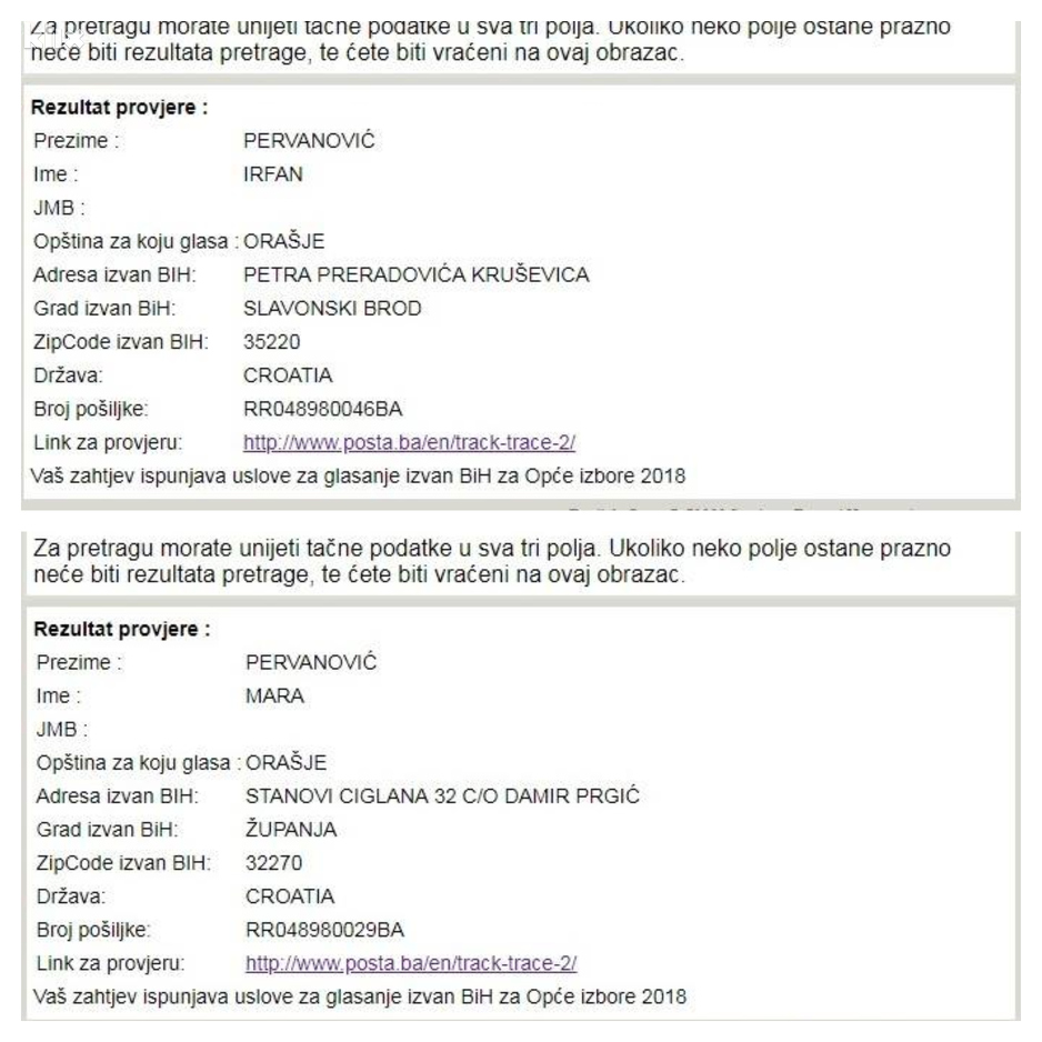 Posebno je zanimljivo da su se Irfan i Mara Pervanović, bračni par koji inače živi u Njemačkoj, na spisku našli na različitim adresama u Hrvatskoj. Irfan na adresi u Slavonskom Brodu, a Mara u Županji. Razdvojeni zarad izborne prevare na Općim izborima u Bosni i Hercegovini 2018. godine.