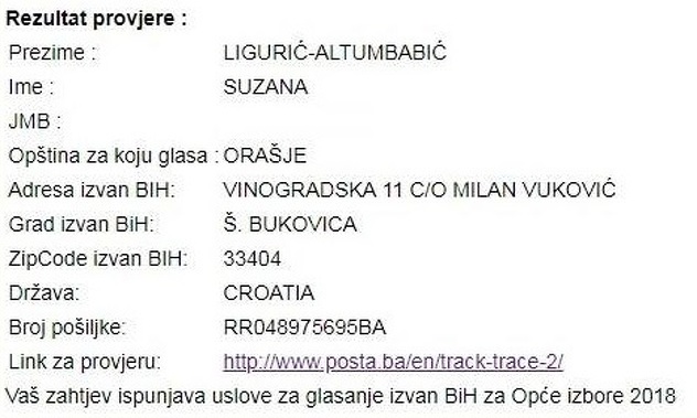 Suzana Ligurić-Altumbabić živi i radi u Njemačkoj. Iako nije planirala glasati na Općim izborima, nalazi se na spisku registrovanih birača za glasanje putem pošte i to sa njoj nepoznate adrese u Hrvatskoj, tačnije iz Špišić Bukovice.